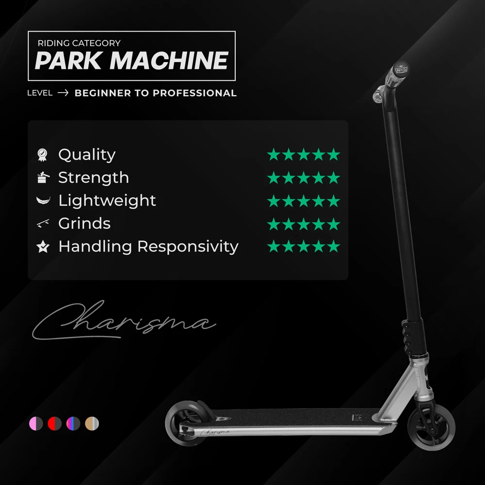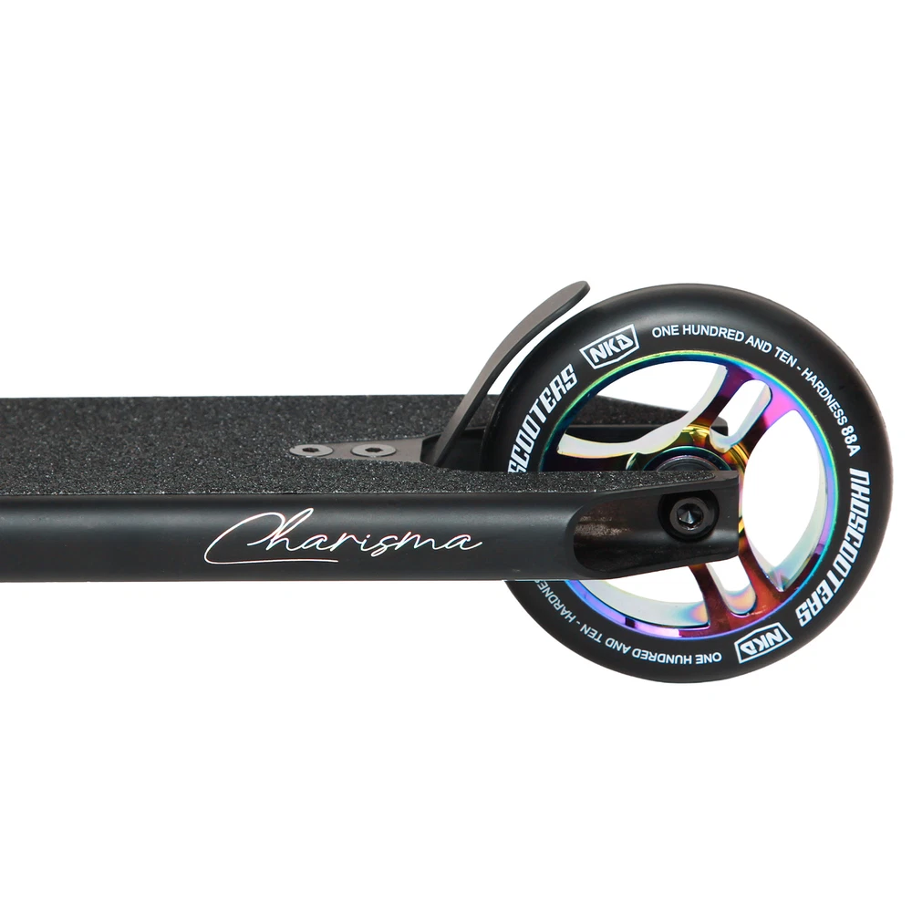 NKDSCOOTERS RIZZ "Charisma" kombinuje štýl, ľahkú konštrukciu a vysoký výkon. Ideálna pre jazdcov, ktorí sú pripravení predviesť svoju charizmu a zručnosť. Očakávajte neočakávané – táto kolobežka posúva hranice a ohromuje dav.